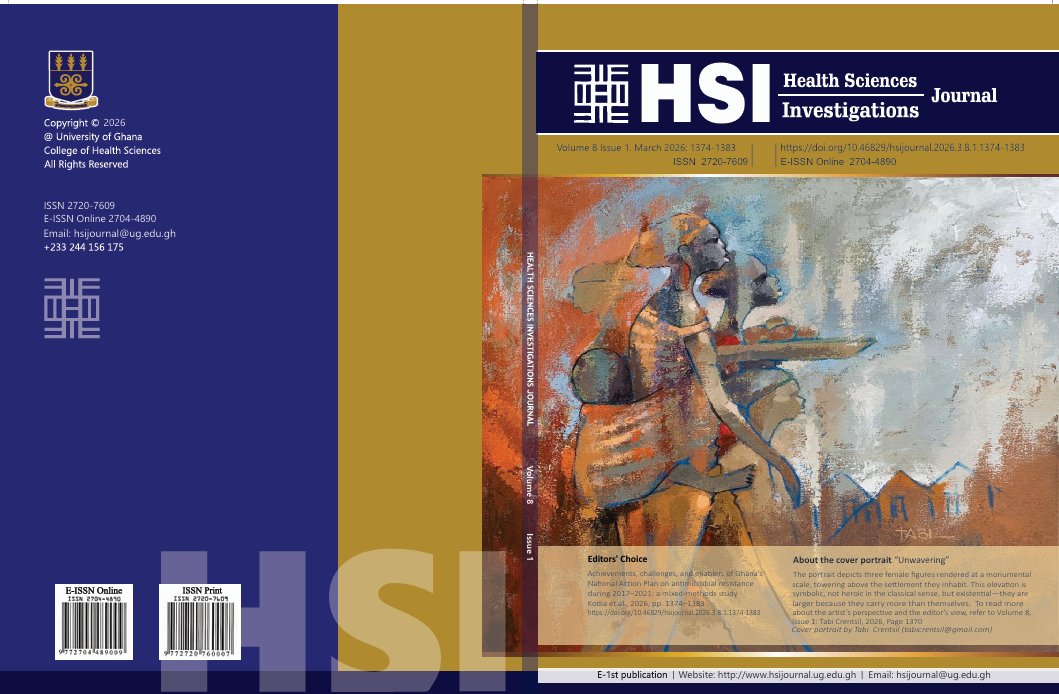 All content in the HSI Journal is published by the University of Ghana College of Health Sciences. All rights reserved. The HSI Journal publishes articles in Open Access at no cost to authors to allow for the widest visibility of the article. All material published in the HSI Journal is for public use and may be printed; however proper referencing and citation are required. The HSI Journal conforms to the Creative Commons Attribution BY license. This copyright license permits others to distribute, remix, tweak, and build upon the published work if the original creation is duly cited.